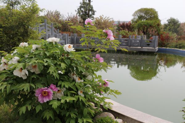 牡丹三兩朵,映入池塘間;