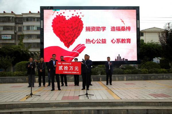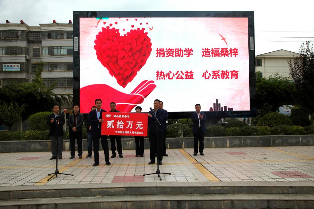 9月26日,“情系家鄉(xiāng)建設 共謀教育發(fā)展”公益助學捐款儀式在徽縣四中隆重舉行。縣委、縣政府、縣教育局有關領導及四中全體師生參加捐款儀式,公司總經理封曉成、副總經理尹向宏出席捐款儀式。