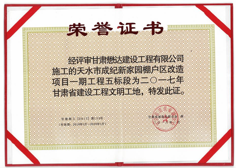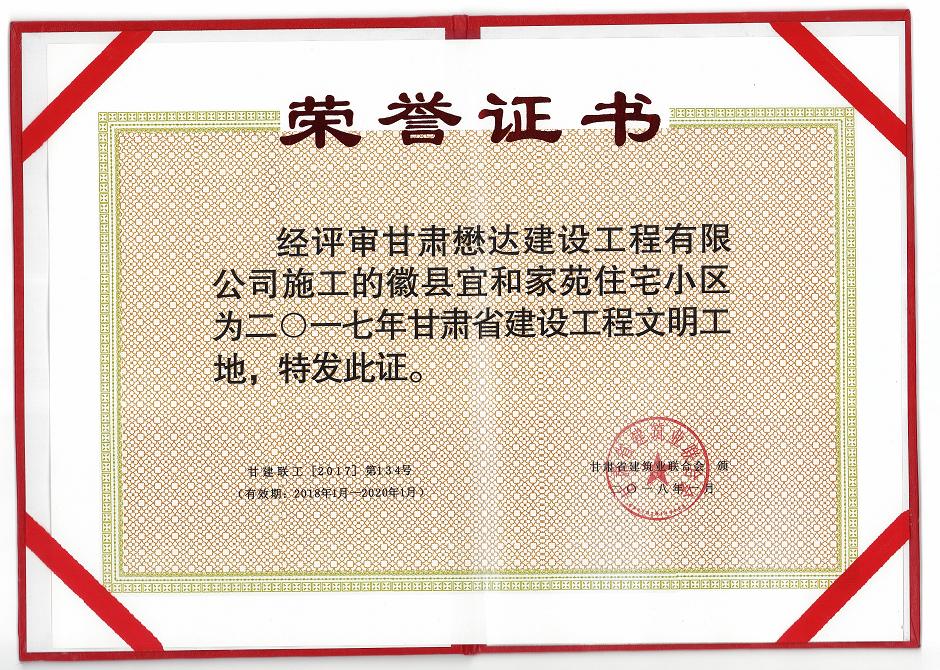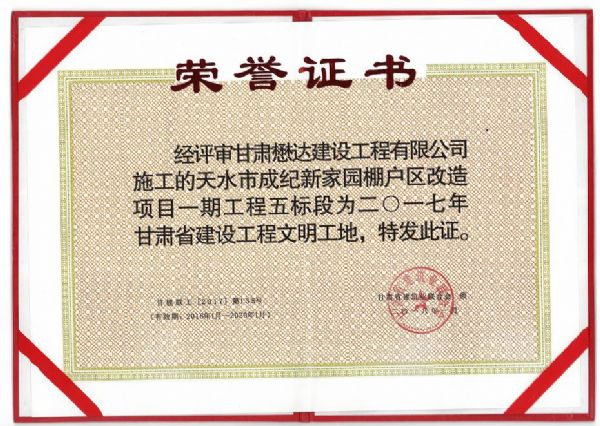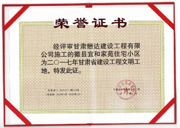日前,由甘肅懋達(dá)建設(shè)工程有限公司承建的徽縣宜和家苑住宅小區(qū)項(xiàng)目、天水市成紀(jì)新家園棚戶區(qū)改造項(xiàng)目一期工程五標(biāo)段項(xiàng)目在2017年全省建筑業(yè)“三優(yōu)一文明”評選中喜獲“2017年甘肅省建設(shè)工程文明工地”榮譽(yù)稱號。