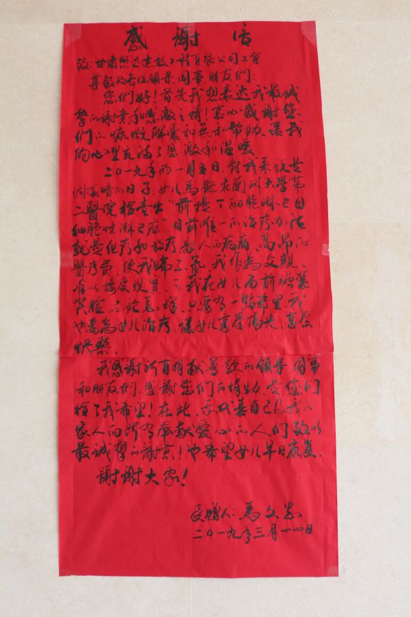 馬文忠女兒馬艷于2019年1月5日入院被確診為前提T細(xì)胞淋巴母細(xì)胞性淋巴瘤,目前仍在醫(yī)院治療之中,僅靠家人的工資無法解決巨額的治療費用。在得知馬艷的病情后,3月9日,公司工會迅速向全體員工發(fā)出獻(xiàn)愛心的倡議,得到積極響應(yīng),僅4天時間就募得善款43270元。