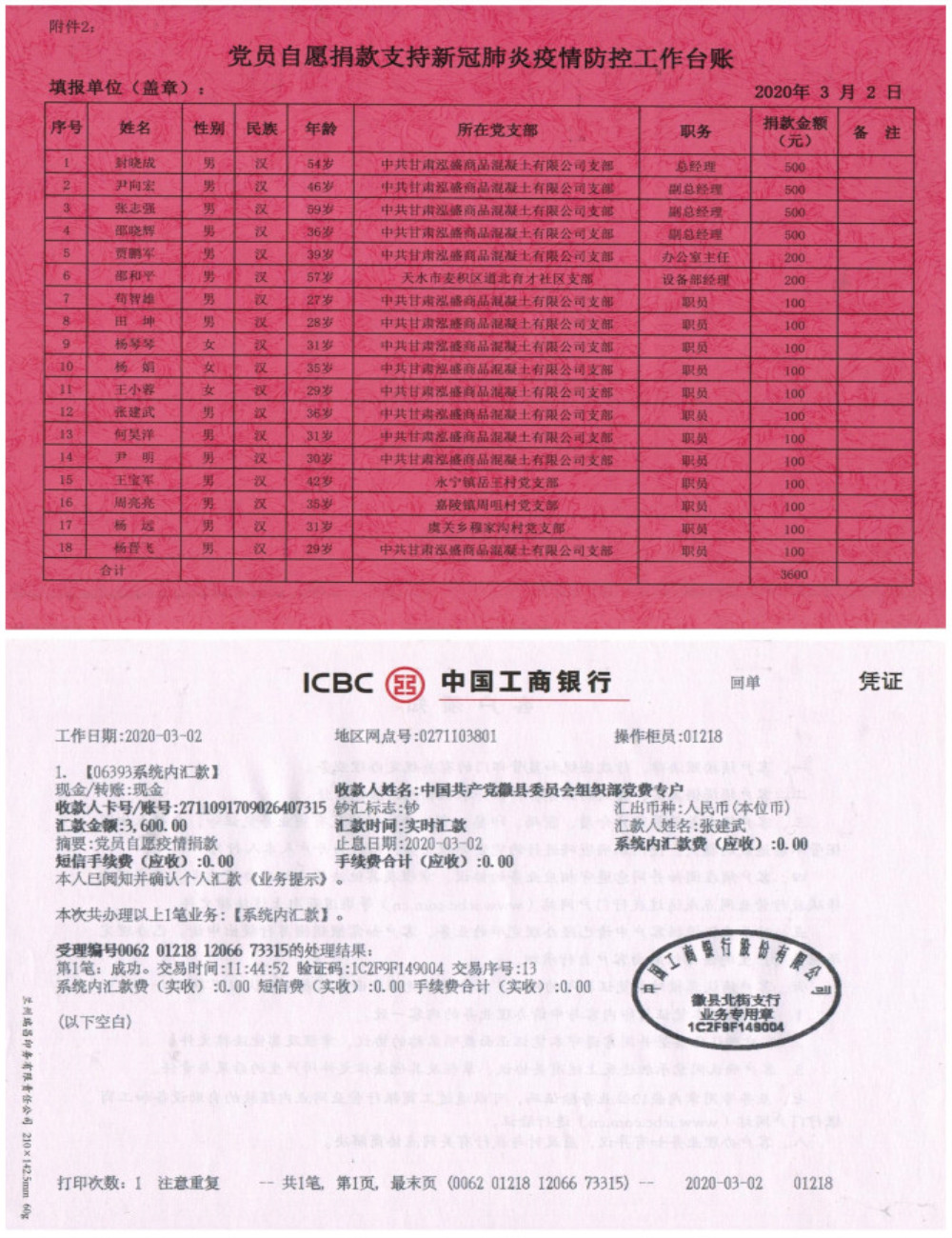 為積極響應(yīng)黨中央對廣大黨員的號召,表達(dá)對新冠肺炎疫情防控工作的支持,3月2日,甘肅泓盛商品混凝土有限公司黨支部組織開展抗擊疫情自愿捐款活動。全體黨員支持疫情防控斗爭愿望強(qiáng)烈,紛紛踴躍捐款。支部18名黨員(含預(yù)備黨員)共計捐款3600元,已按組織程序上繳中國共產(chǎn)黨徽縣委員會組織部黨費(fèi)專戶。
