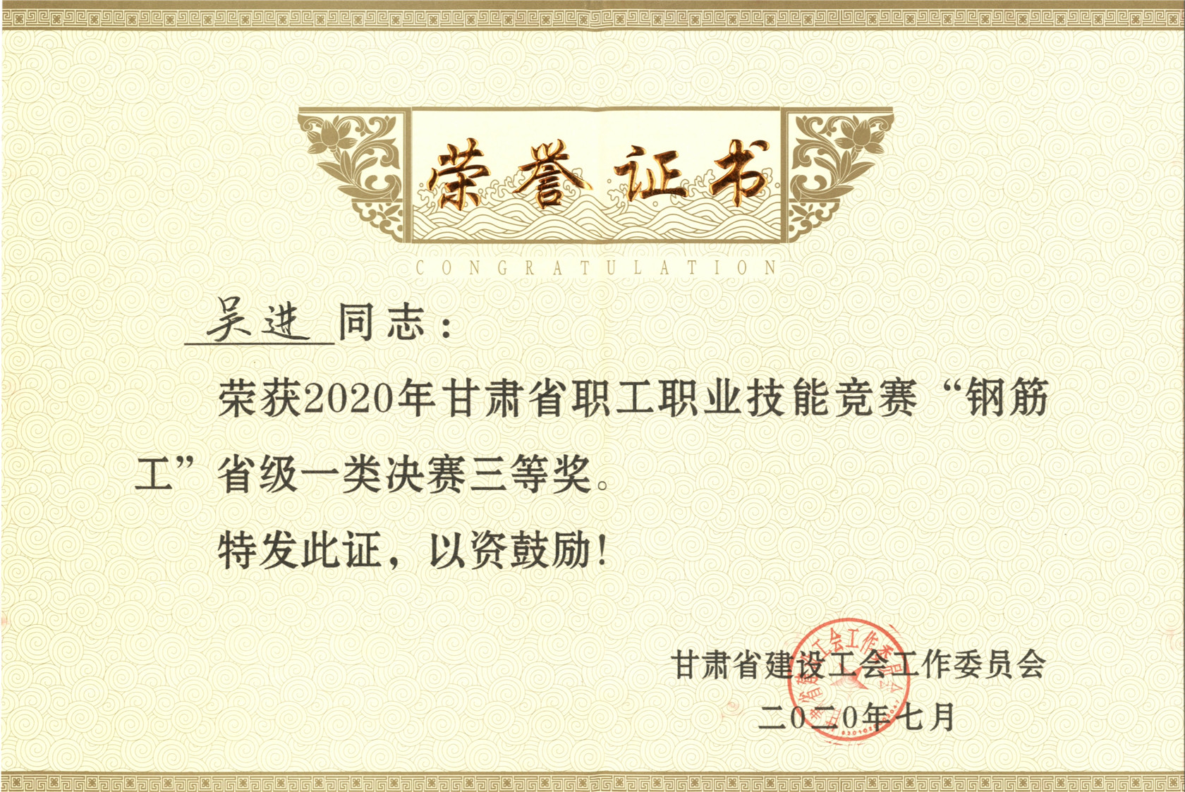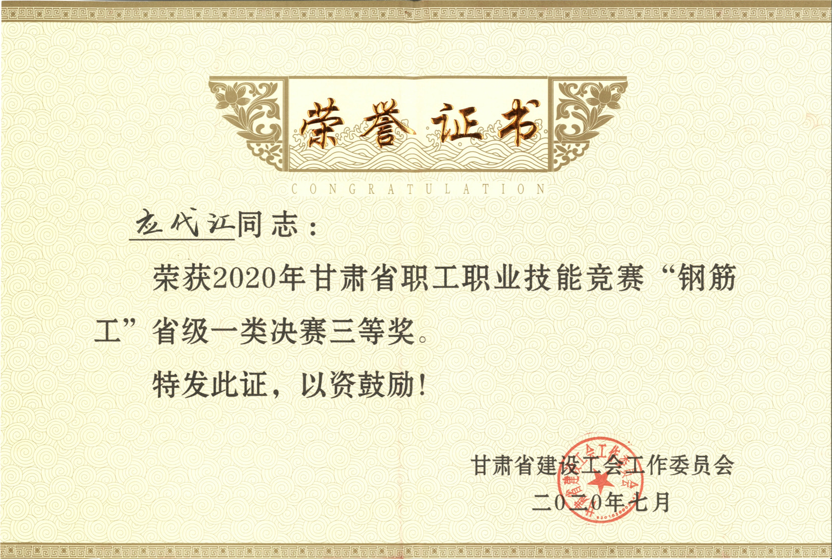 代表公司參加2020年甘肅省職工職業(yè)技能競(jìng)賽“鋼筋工”大賽的吳進(jìn)、應(yīng)代江,榮獲省級(jí)一類決賽三等獎(jiǎng)榮譽(yù)證書。