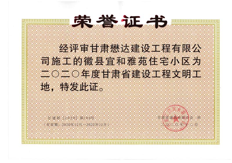 近日,公司承建的徽縣宜和雅苑項(xiàng)目被甘肅省建筑業(yè)聯(lián)合會表彰為2020年度甘肅省建設(shè)工程文明工地榮譽(yù)稱號。