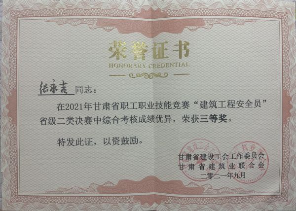 競賽依據(jù)建筑行業(yè)相關(guān)安全法律法規(guī)及標(biāo)準(zhǔn)規(guī)范,由理論知識考試和實(shí)際操作考核兩個模塊組成,來自全省的25個代表隊(duì)的50名安全員參加了此次競賽活動。經(jīng)過一天的激烈角逐,張永吉排名全省第十,榮獲甘肅省職工職業(yè)技能競賽“建筑工程安全員”省級二類決賽三等獎;張宏明榮獲優(yōu)秀選手榮譽(yù)稱號。