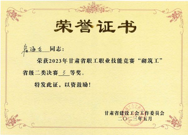 5月16-17日,2023年甘肅省職工職業(yè)技能競賽“砌筑工”省級二類決賽在天水市舉行,懋達建設崔海龍、胡三桂在全省多家建筑企業(yè)層層選拔的39名選手中脫穎而出,分別獲得三等獎、優(yōu)秀獎的好成績。
